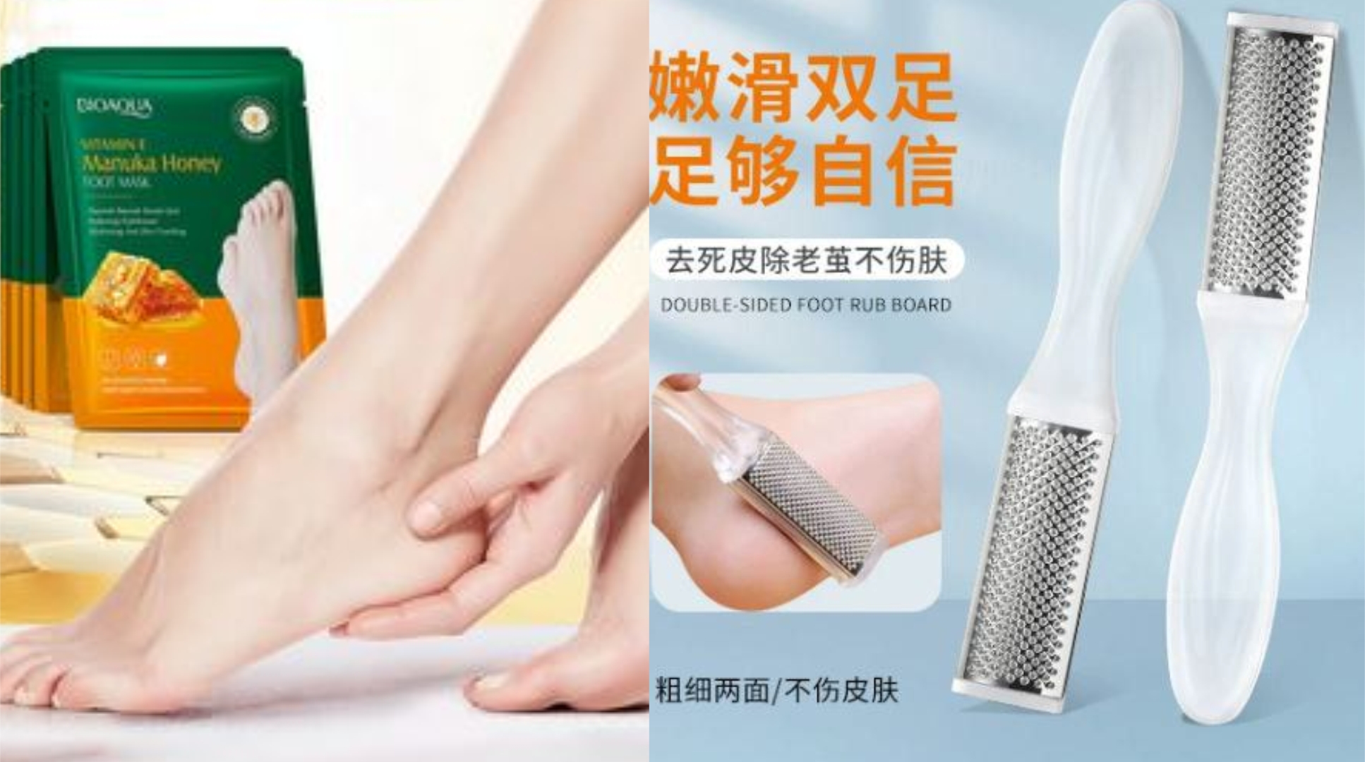 This Honey Foot Mask + Aluminium Scrubber combo removes hard skin and locks in moisture.